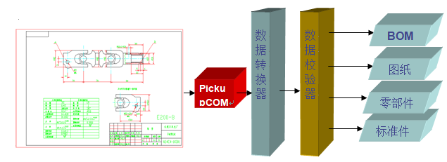? ? ? 原AutoCAD圖紙的歸檔和數據提取是一直困擾企業信息化實施過程中的一個問題。”共好”在這方面有非常好的表現,我們提供了一個獨立于AutoCAD和PLM系統的PickUpCom組件,通過PLM調用該組件自動提取AutoCAD圖紙中的歸檔信息(如圖號、名稱等)及產品結構數據(裝配圖的明細表信息)。