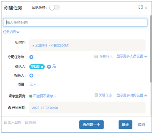 當(dāng)團隊任務(wù)的開關(guān)打開后,我們在分配任務(wù)的時候就可以選多人,點確定后就可以創(chuàng)建一個團隊任務(wù)。