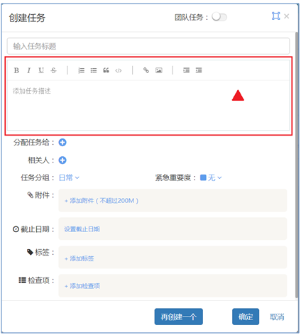 創(chuàng)建任務(wù)時必須要輸入的屬性是“任務(wù)標(biāo)題”,如果任務(wù)標(biāo)題無法把任務(wù)描述清楚,可以點上圖“創(chuàng)建任務(wù)”彈框中的“添加任務(wù)描述”,點擊后彈框中會出現(xiàn)任務(wù)描述輸入?yún)^(qū),如下圖紅色框線區(qū)顯示: