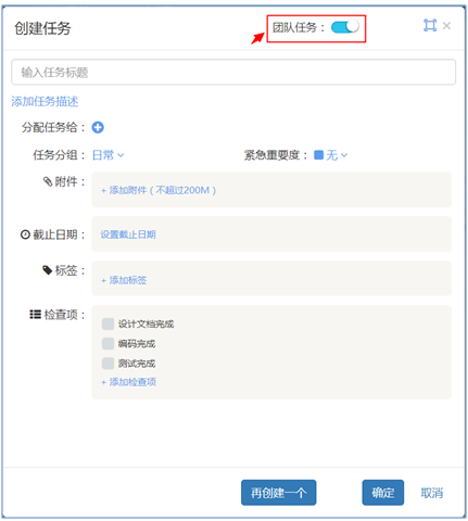 創(chuàng)建團隊任務(wù)的入口和方法同上面的任務(wù)創(chuàng)建,不同的是創(chuàng)建團隊任務(wù)需要把團隊任務(wù)的開關(guān)打上,如下圖紅色框線區(qū)域顯示。