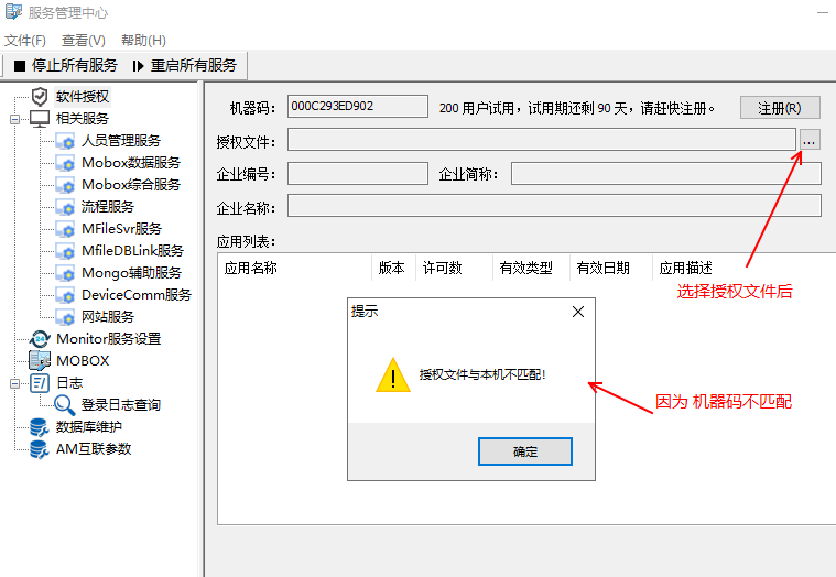 2)授權文件的機器碼與當前服務器的機器碼不一致(注冊的時候會出現)