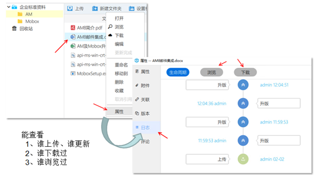 在文檔管理系統(tǒng)中任何人對文檔進行了任何操作均會留下痕跡,下圖是文檔瀏覽日志示例,在文檔管理系統(tǒng)中點開一個文檔進行瀏覽時可以在頁面的右邊欄里查看該文檔的所有操作日志